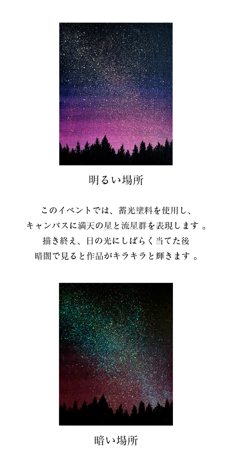 このイベントでは蓄光塗料を使用し、キャンバスに満天の星と流星群を表現します 。