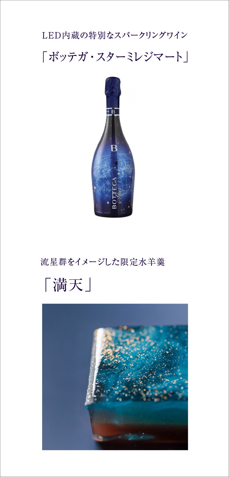 さらに、この時期にしか味わえない、流星群をイメージした限定水羊羹「満天」をお楽しみいただけます 。
